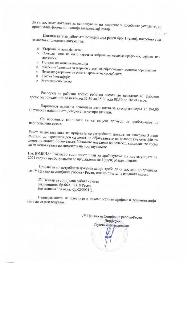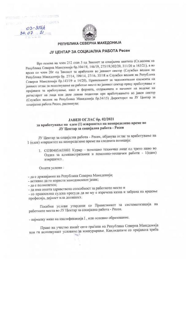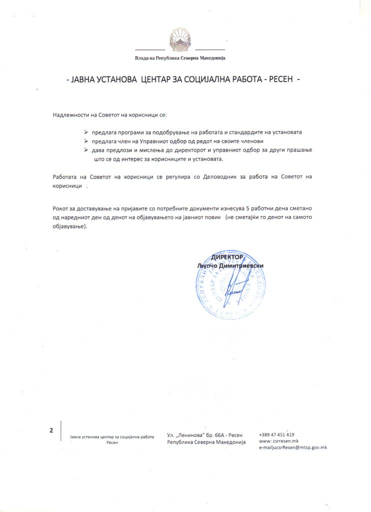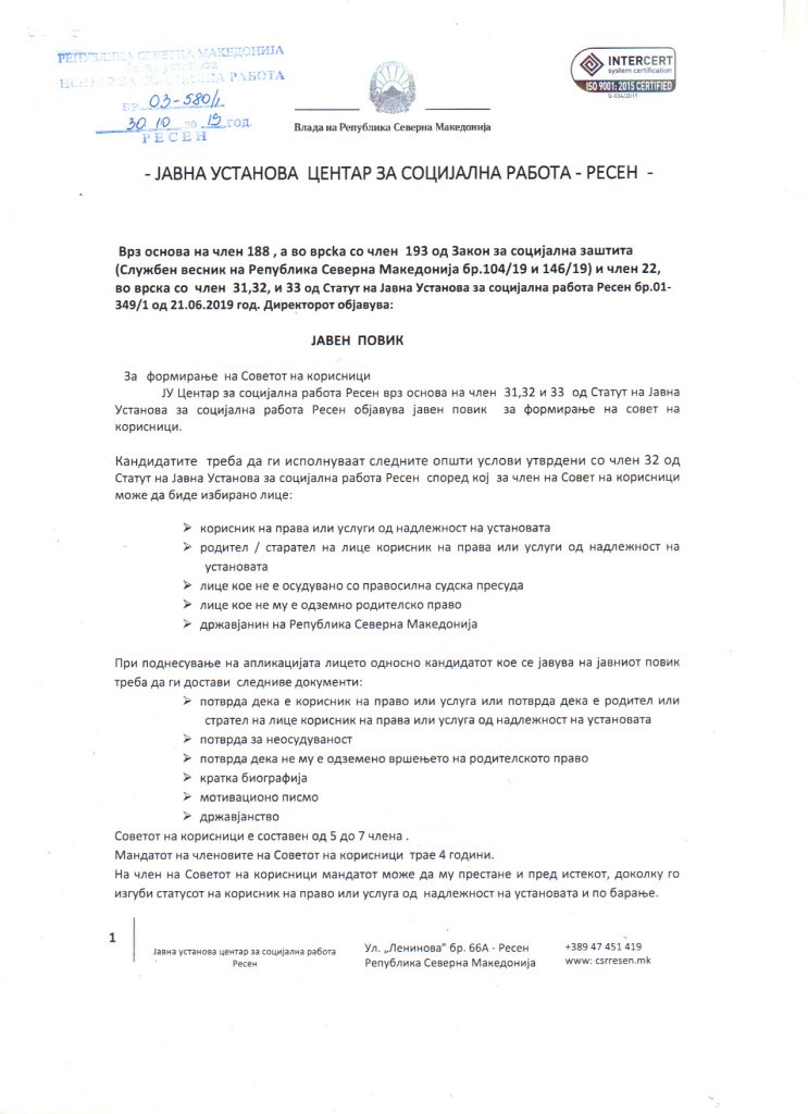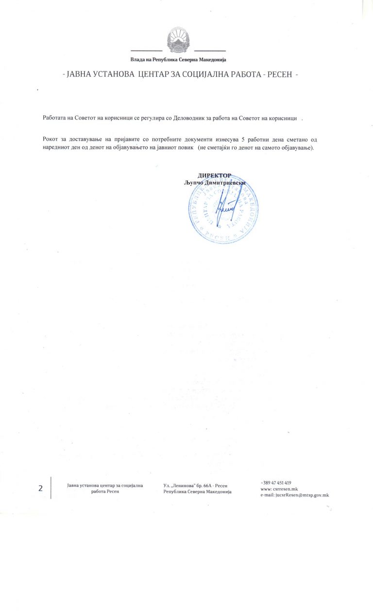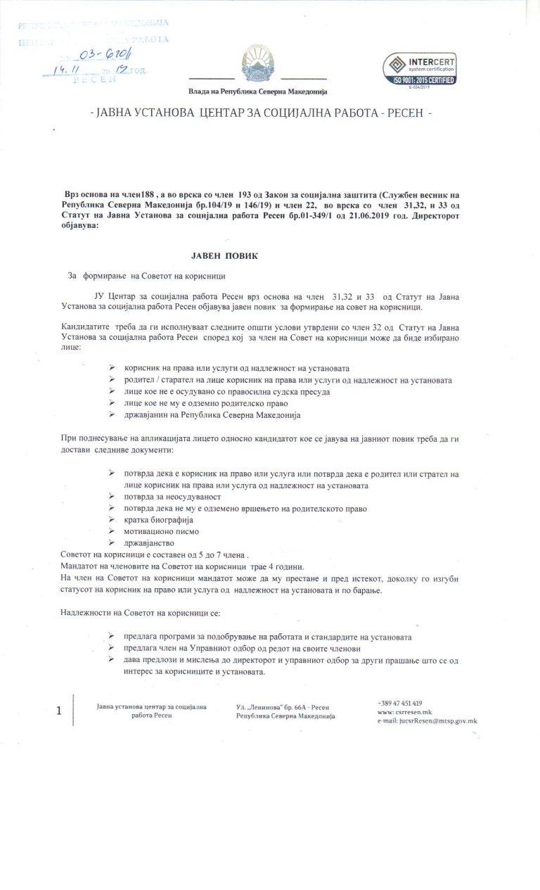 – Интерна процедура за планирањето и спроведувањето на постапките за јавни набавки во ЈУ Центар за социјална работа Ресен